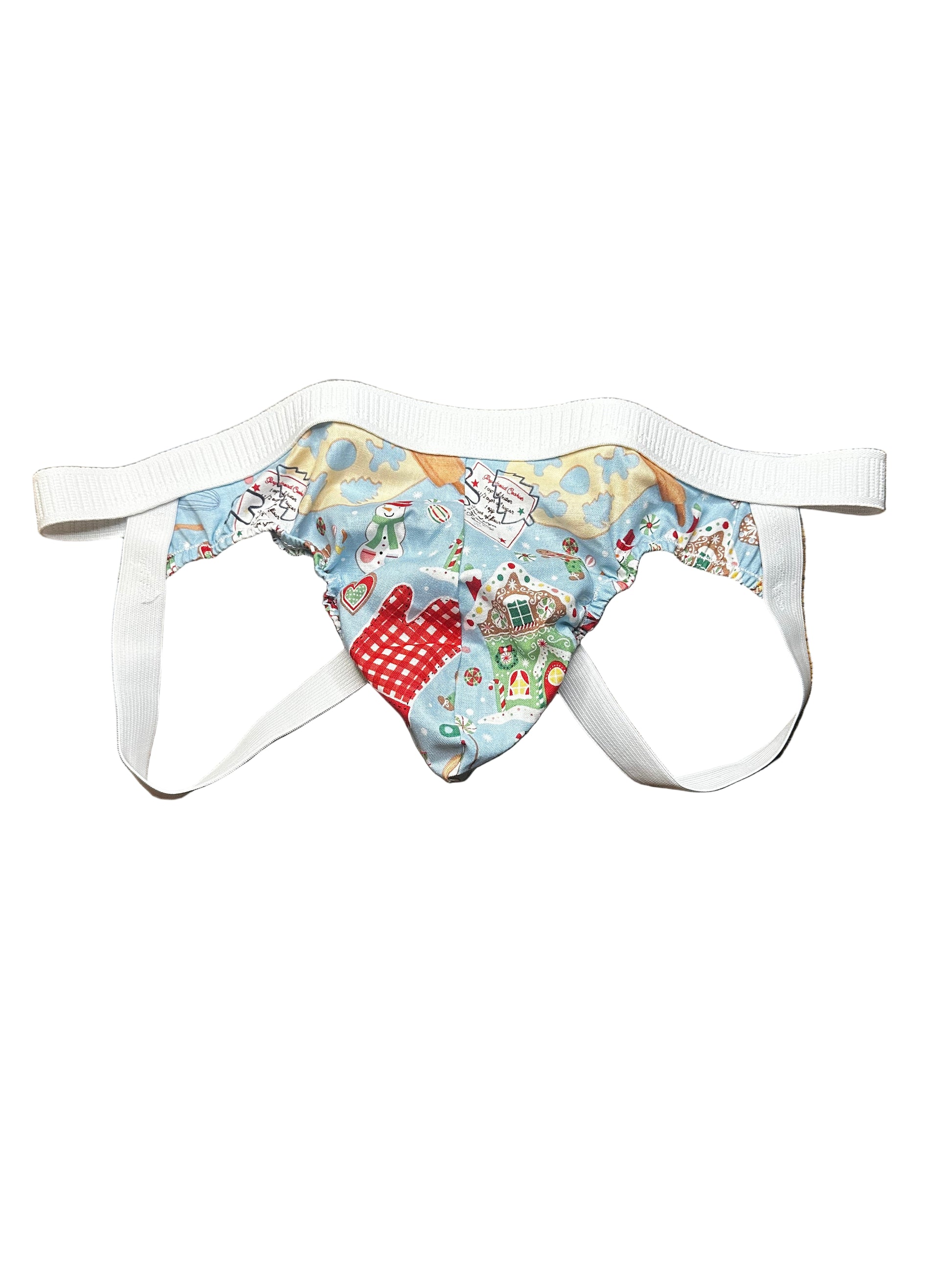 There’s something about the smell of cinnamon and sugar in the air that brings you right back to Grandma’s kitchen — warm light, flour on the counter, and laughter that fills the whole house. Rolling Pin Ready is stitched with that same feeling of home. With its soft blue fabric covered in gingerbread men and baking treasures, and crisp white banding that keeps things clean and classic, this handmade jock captures the heart of holiday comfort. It’s a little sweet, a little playful, and made to remind you that the best things in life — like good company and handmade care — never go out of style.